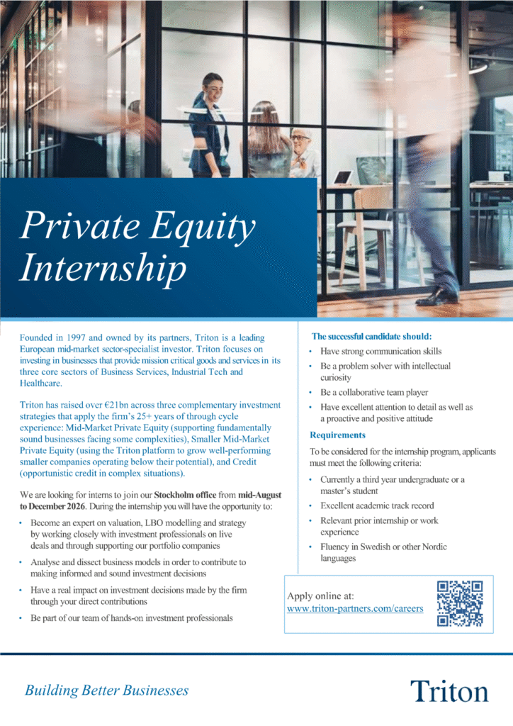 Private EquityInternship / SEB Equities - Part Time Trader / By Apply here: https://www.triton-partners.com/careers